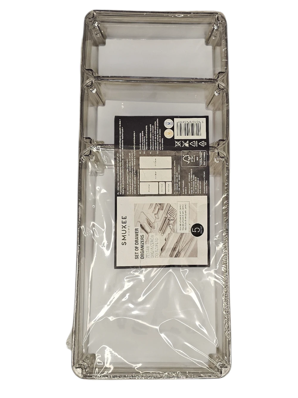 Jeden zestaw zawiera 5 sztuk pojemników w 3 różnych rozmiarach do organizacji szuflad, które pomogą Ci dostosować kombinacje przedmiotów do przechowywania w szufladach, na półkach, w szafach i szafkach.